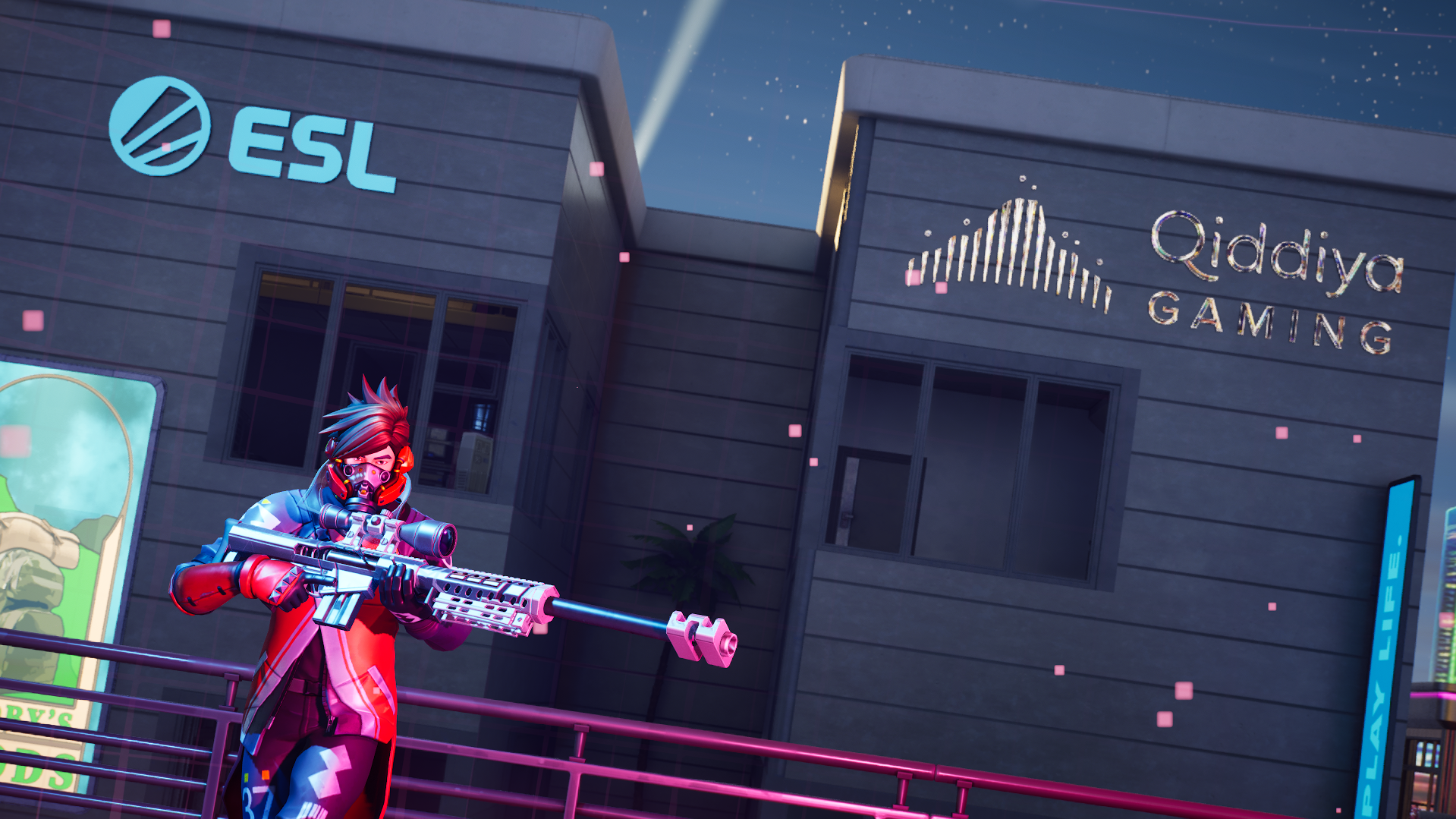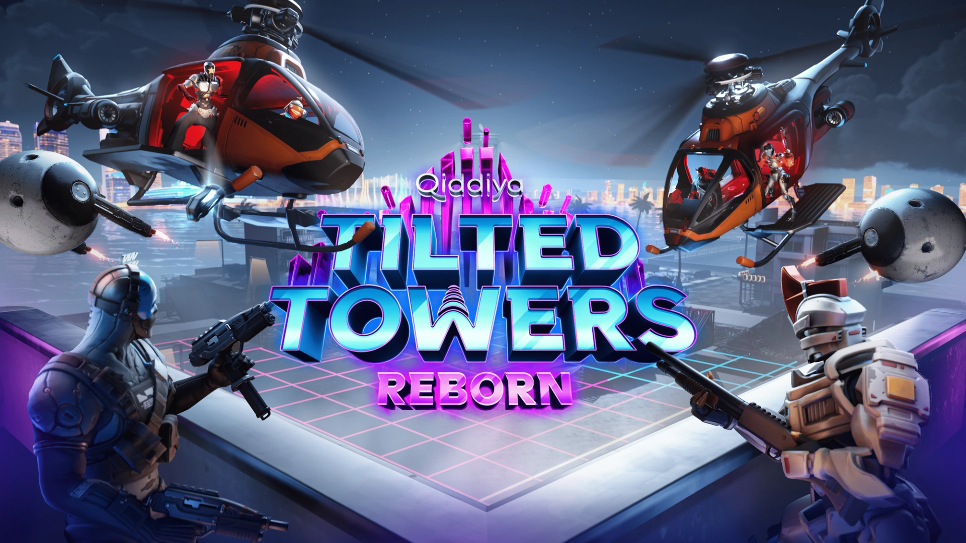 Battle in a high-intensity Team Deathmatch set in a cyberpunk-inspired Tilted Towers.